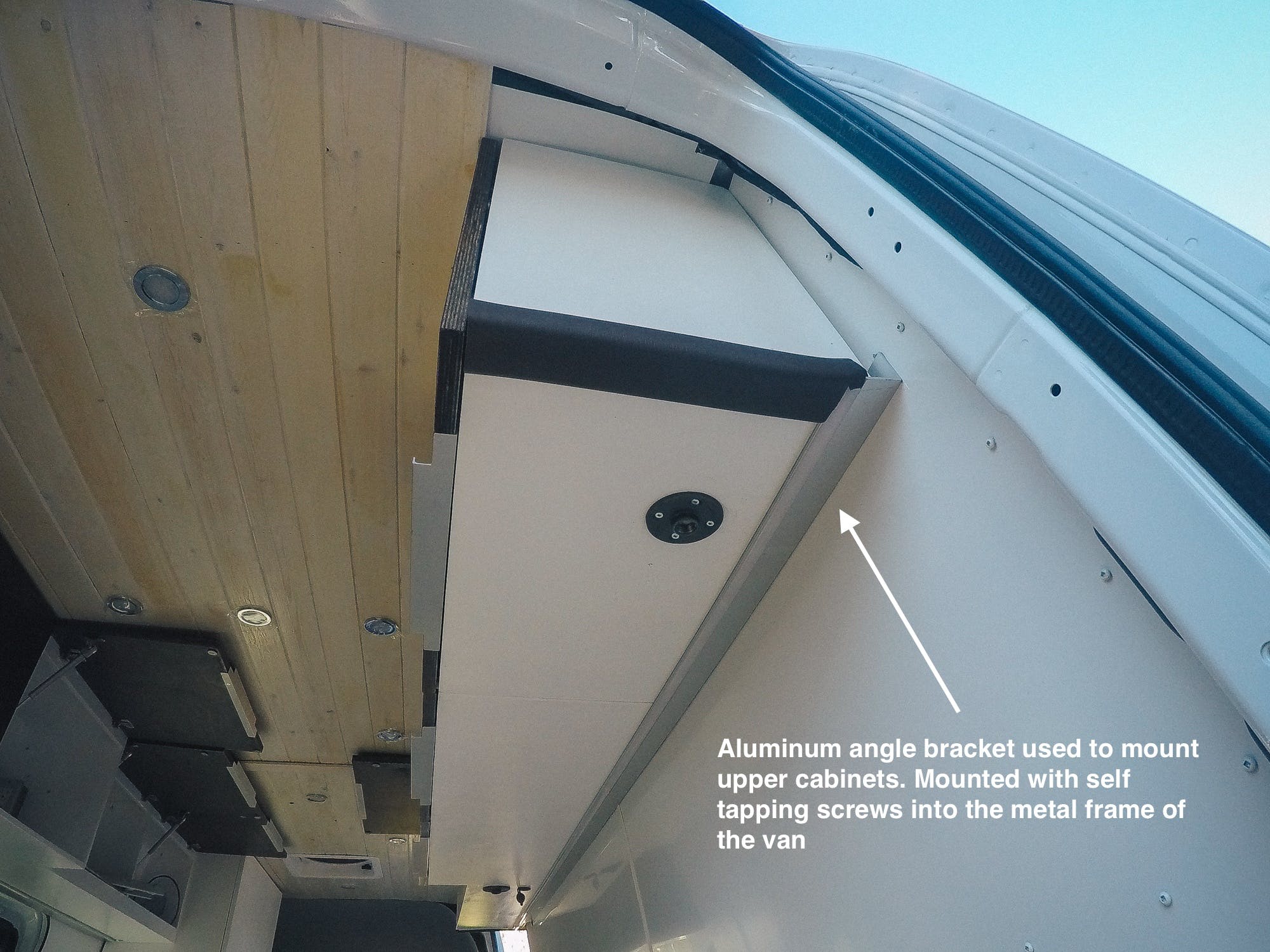 For the bottom edge of the upper cabinets, I purchased an 8ft section of angle aluminum from Home Depot, and using larger self-tapping screws fastened the angle piece through the wood strapping into the metal bracing of the vehicle.