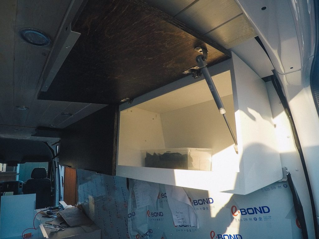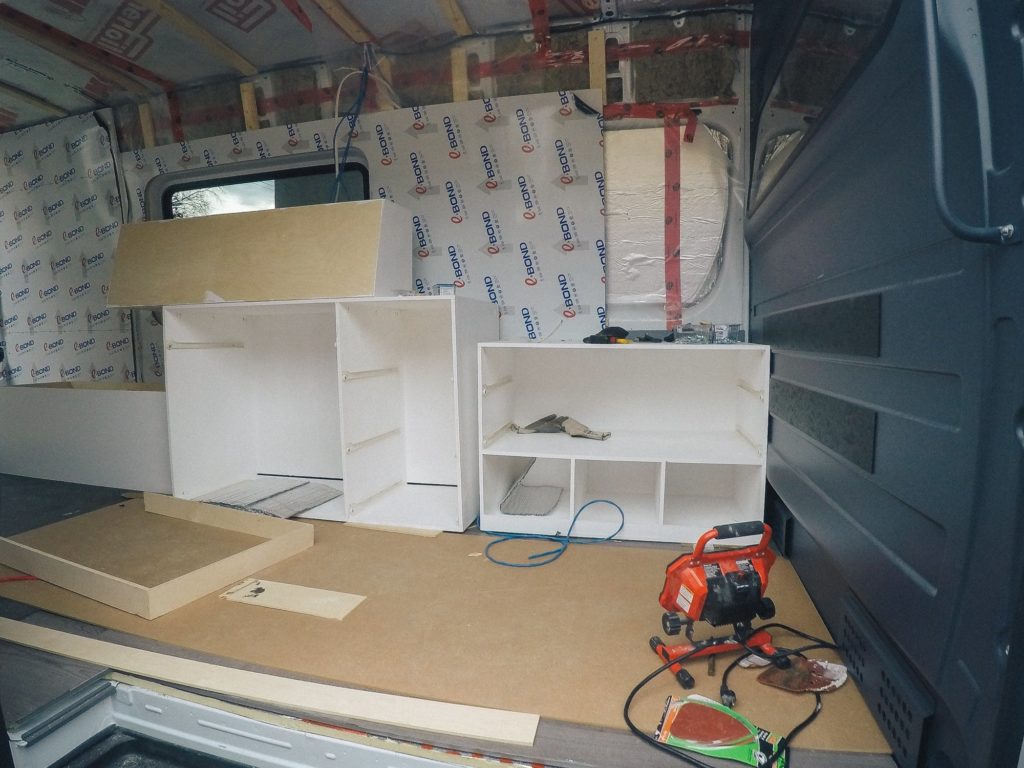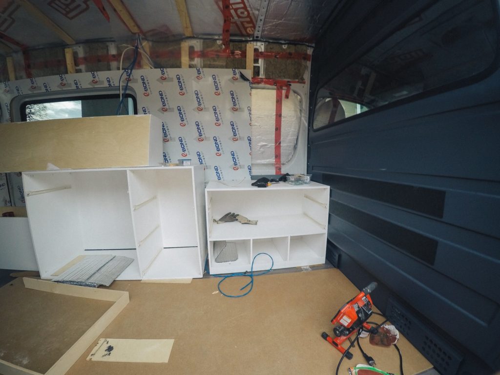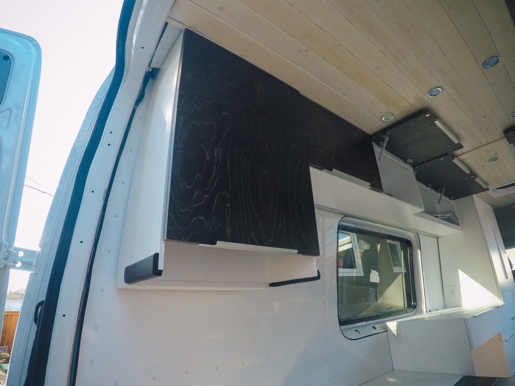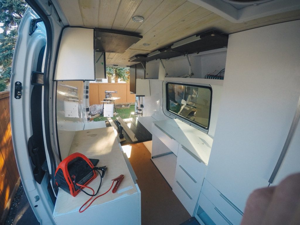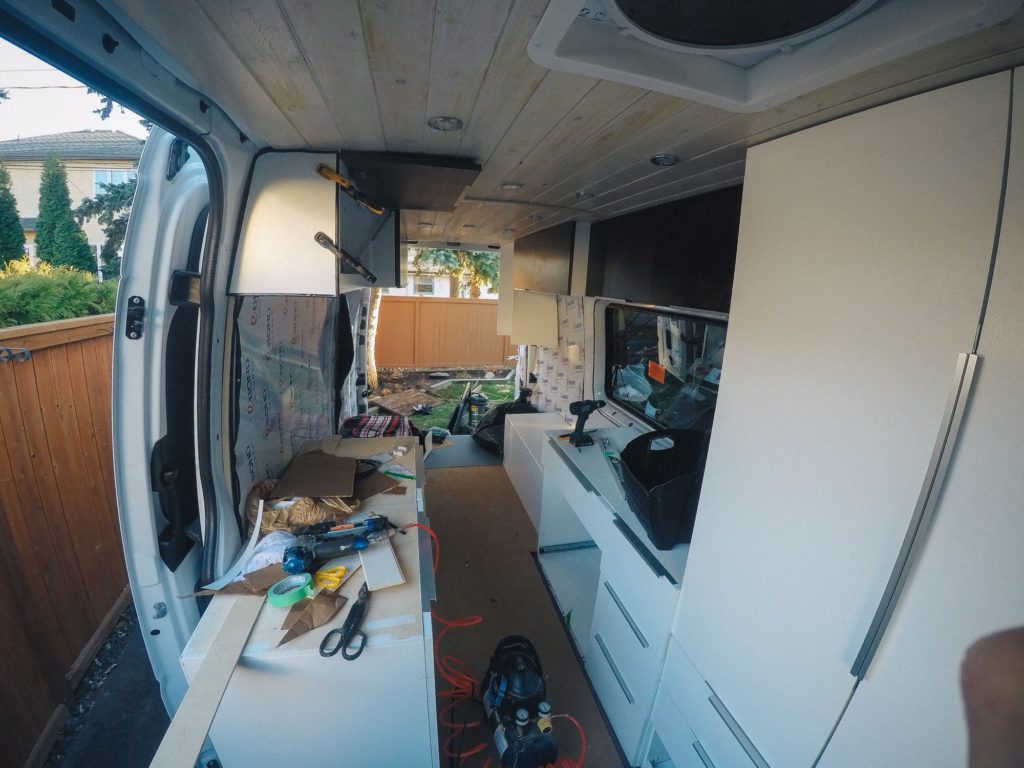 Finally having the cabinets installed in the van was a huge milestone to achieve in the build process. Just the fact that I no longer had to move things in and out of the van every time I wanted to work on it made everything seem to move much much faster. Also being able to utilize the cabinets and storage for tools and materials during the build greatly cleaned up the work area and made things seem a lot more efficient and productive.