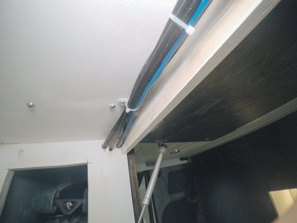 Bringing the cabinets into the van was a definite two-person job and as one person held the large 8+ ft cabinet in place the other person fastened the cabinets through the top from inside the cabinet into the wood strapping that was installed going across the ceiling of the van.