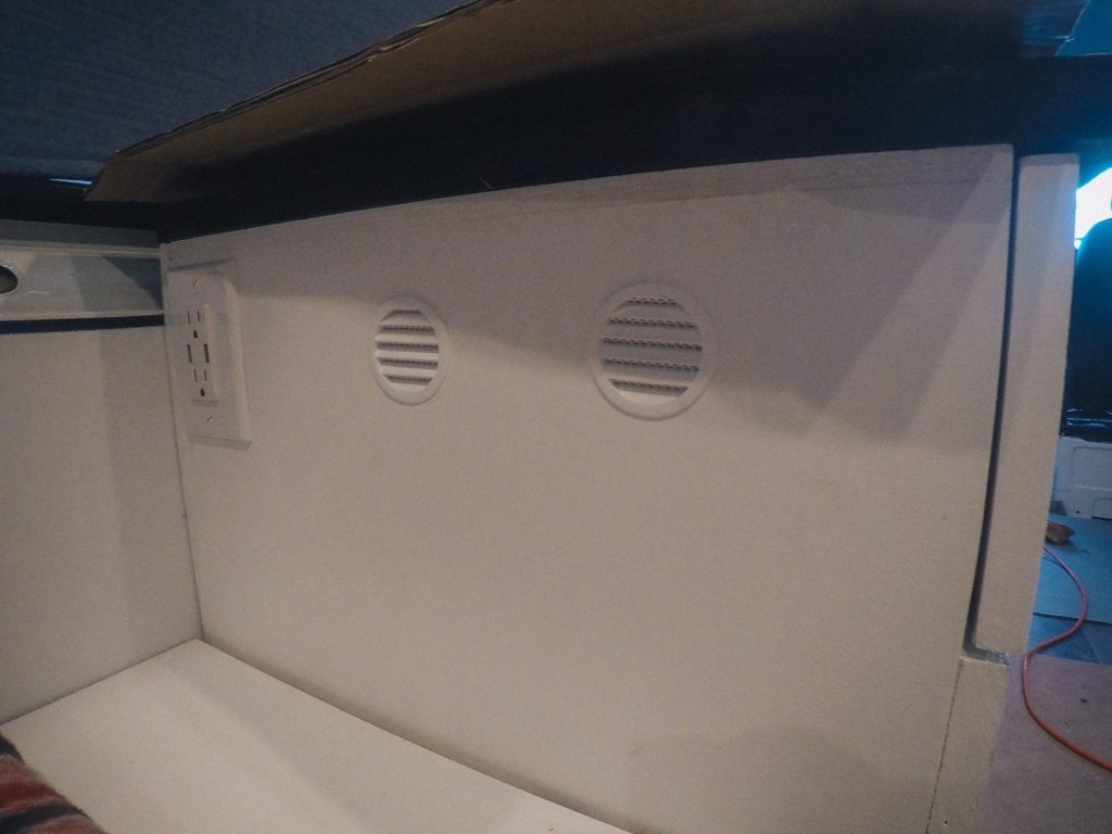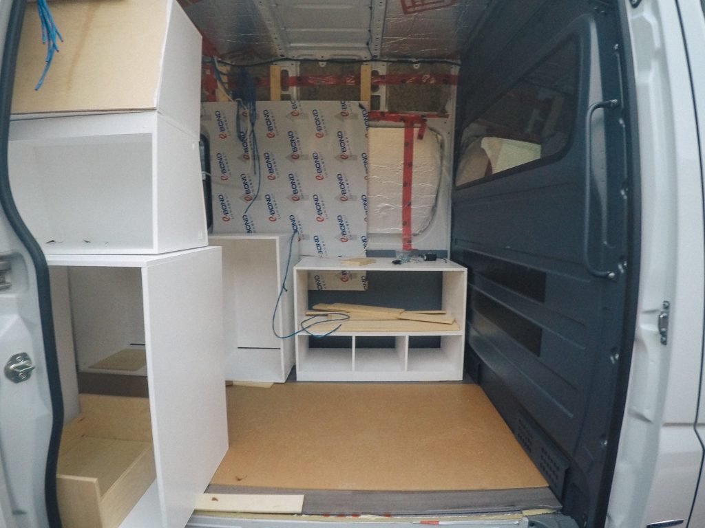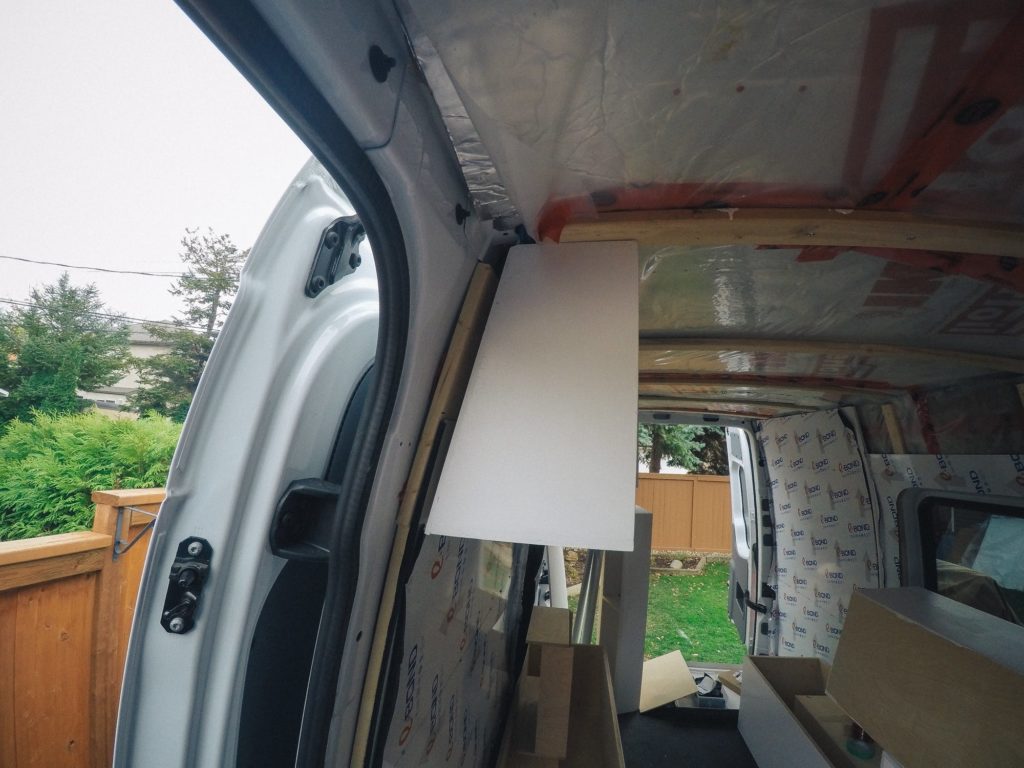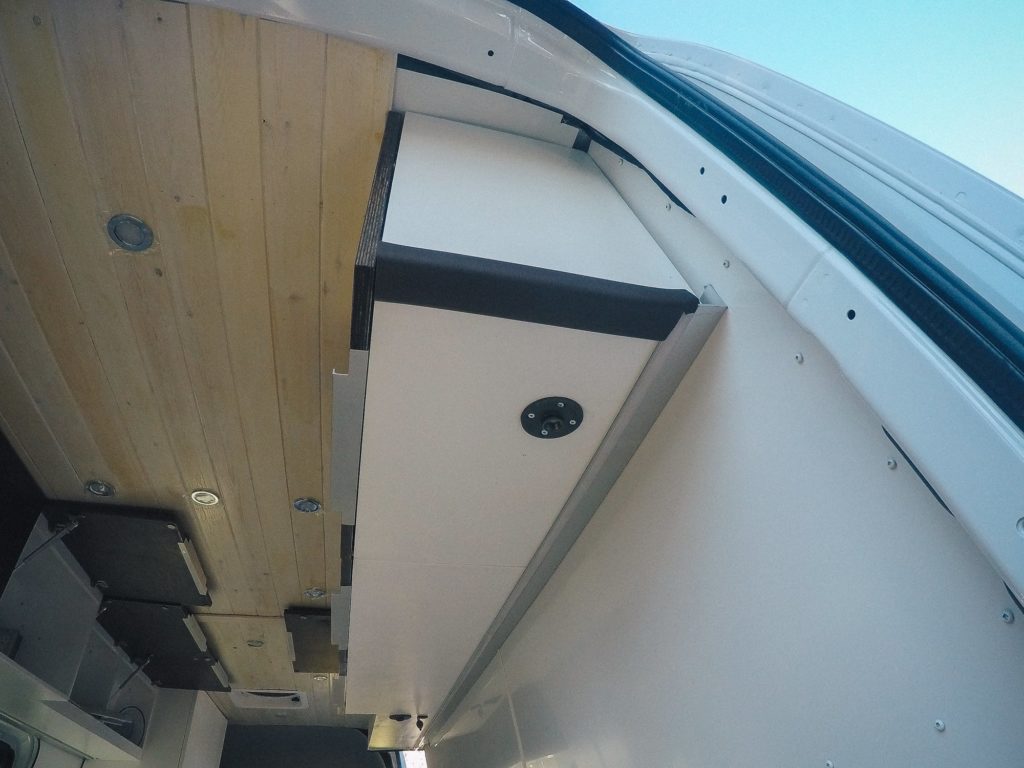 For the top section of the unit, I built this unit as a very basic hanging closet. The unit was fairly easy to build and then the only difficult part was templating the side panels so they followed the curve of the vehicle. When doing this cardboard and patience are your friend, it is important that the unit snugs up nice and close to the wall otherwise when it comes time to fasten it in place you will have issues.