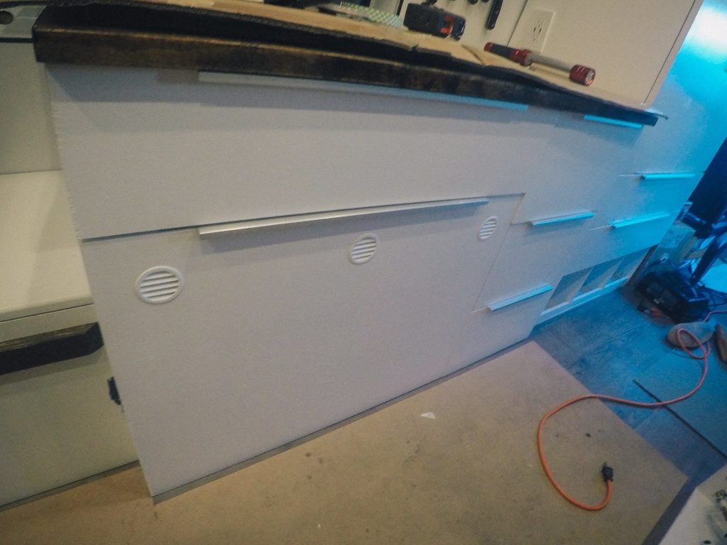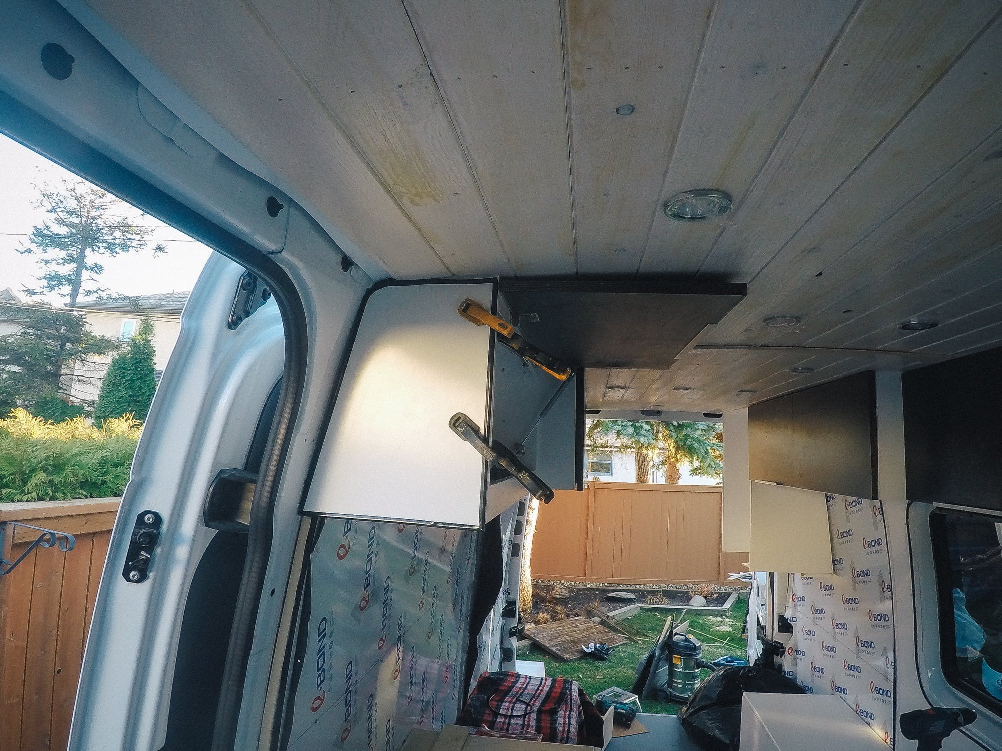 Once I had the cabinets built and it was time to mount the lower cabinets, it was pretty straight forward. When I framed up the inside of the van I made sure I had enough strapping in behind the ACP walls that I could easily screw the cabinets into the strapping and securely fasten them to the vehicle.