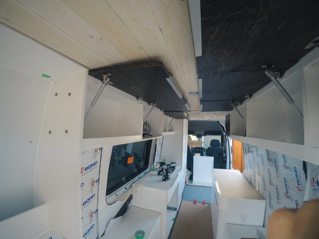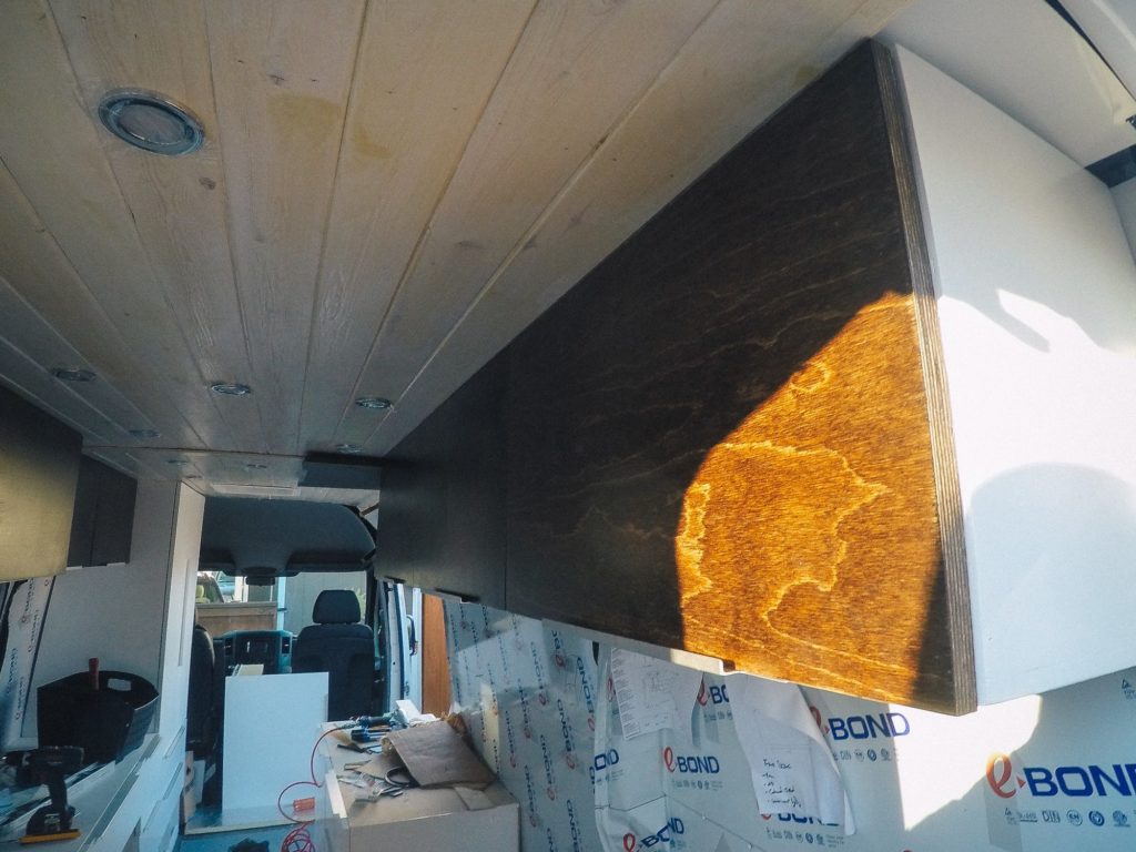 I found the hardest part about building the upper cabinets was finding the right angle at the top to follow the curve of the vehicle. On the bottom cabinets, the curve of the vehicle wasn’t something I needed to worry about, but at the top edge of the Sprinter van there is a considerable curve that you need to account for or else you will lose substantial cabinet space.