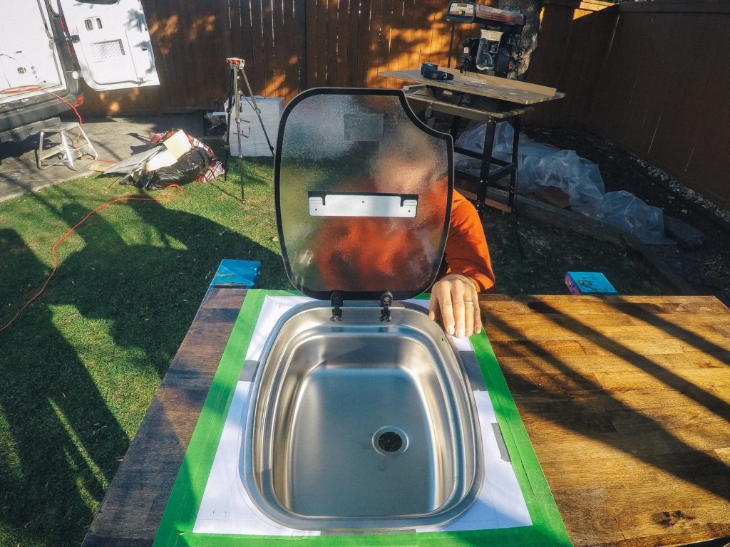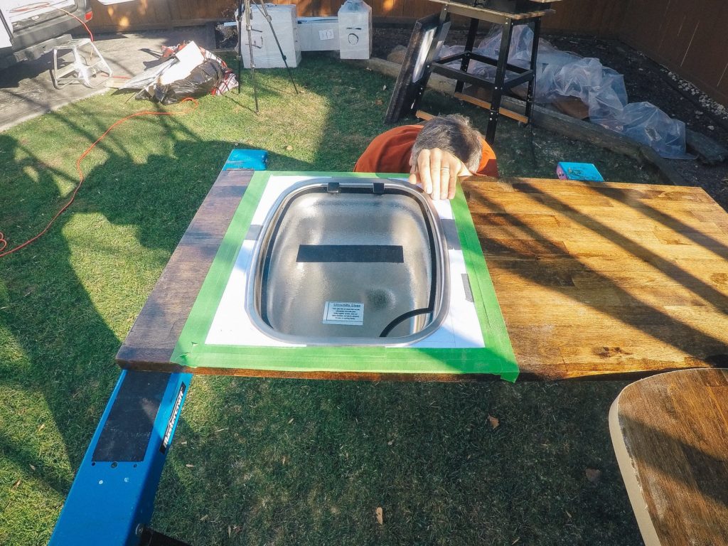 By the time you get to the point of cutting in the cooktop and sink you have put quite a bit of work into the counters with cutting, sanding, staining, and sealing that error in measurements here would not only cost you money but considerable time. Before I started cutting out the openings for the sink and cooktop we created templates out of paper that we could use to trace onto the counter and use those lines to cut along.