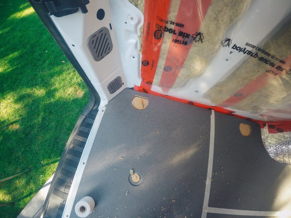 When you have your plywood sub floor installed, which I talk about in the insulation section, you’re ready to have your flooring installed. Since I reused the existing floor that came with my van I had to plug some of the holes before I was able to install laminate plank flooring.