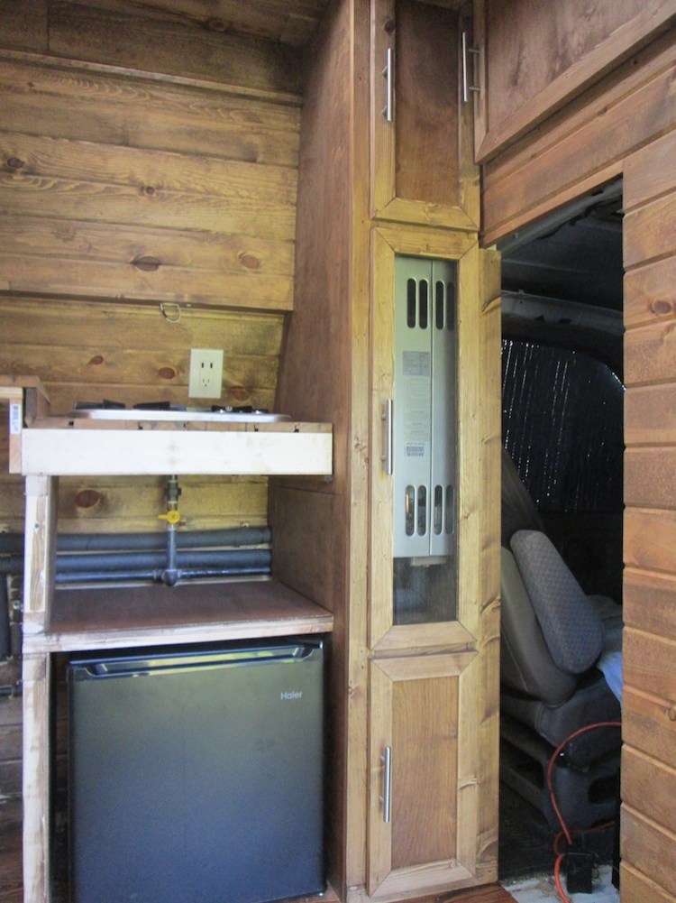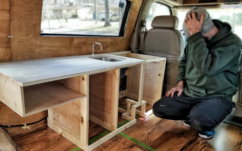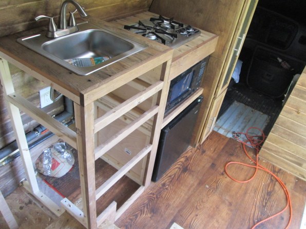 Please note that if you are not sure of how to professionally install a kitchenette complete with plumbing and gas works, work with a professional. Or, you can purchase pre-built cabinetry and countertops instead of making everything from scratch. Keep in mind things like the depth of the cabinets – bathroom cabinetry is often shallower than kitchen cabinetry and works well in a narrow van.