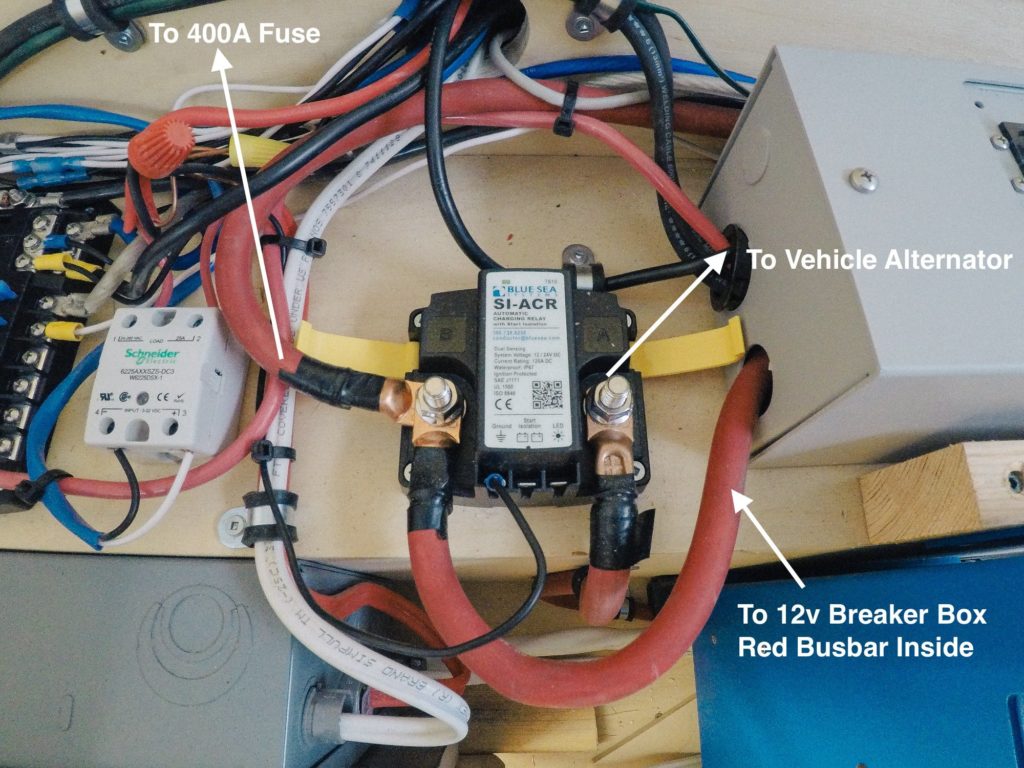 The ACR has three wires coming off it and they are all done using 1/0 welding cable. One wire runs from the Midnite Breaker box bus bar to the ACR, the second wire is the wire that connects the ACR to the vehicle battery / alternator and the third wire is connected to the 400A fuse between the (2) AGM batteries.