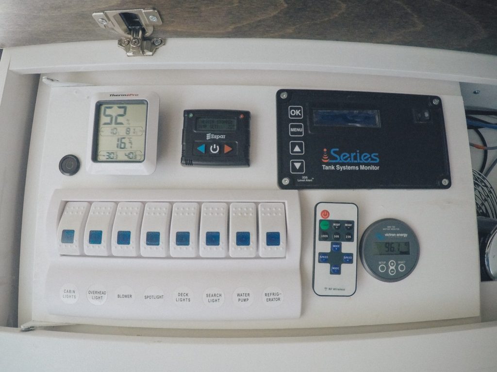 In my control panel area that I located all my switches you will see that I used 8 panel marine rocker switch. One thing to note is that each switch if you remove the white faceplate has its own built in fuse ranging from 5-15 A. So just keep this in mind as I originally had my fridge on a 5A switch and it popped the fuse on me before I knew about those fuses…. Lets just say i wasted a good couple hours troubleshooting a 10 second fix.