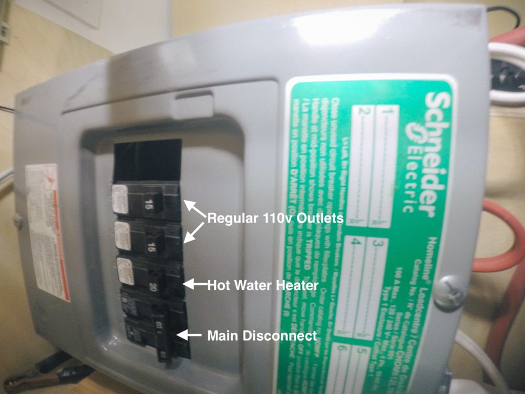 The breaker box has (2) 15A Circuits for the 110 Outlets (1) 20A Breaker for the Hot water Tank and then a Double 60A which is functioning as the main disconnect on the system since Im using a sub panel I had to hack the system this way to get a main disconnect.