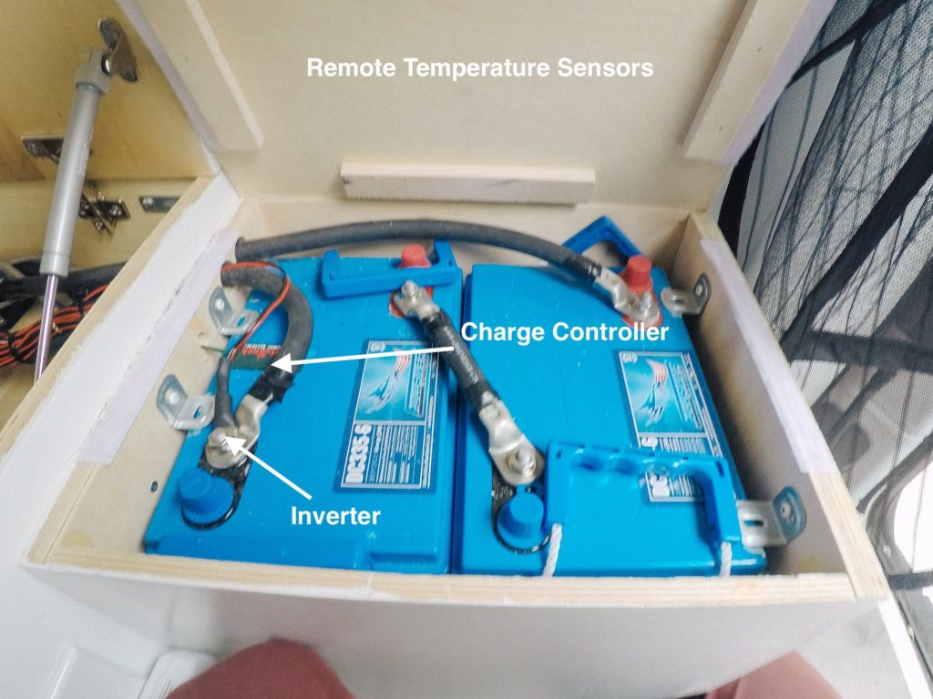 In the battery photos you will see 2 other small gauge wires, both of these wires are remote temperature sensors. The green one you see stuck to the battery is for the charge controller and then the thin wire you see on the top left negative post is for the inverter. Both of these RTS are just wire directly into the respective device and it’s clearly labelled where they plug in.