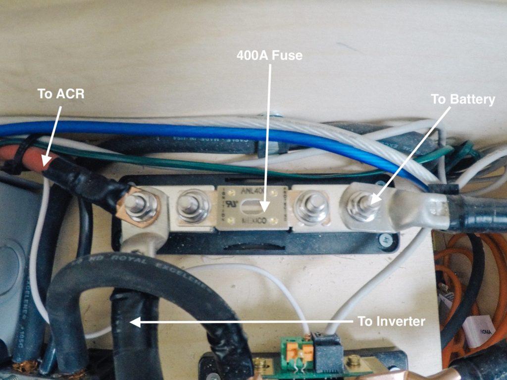 Mentioned above we talked about the large 400A fuse between the ACR and the batteries, I also ran a 4/0 welding cable wire from the same side as the ACR to bring power to the inverter.