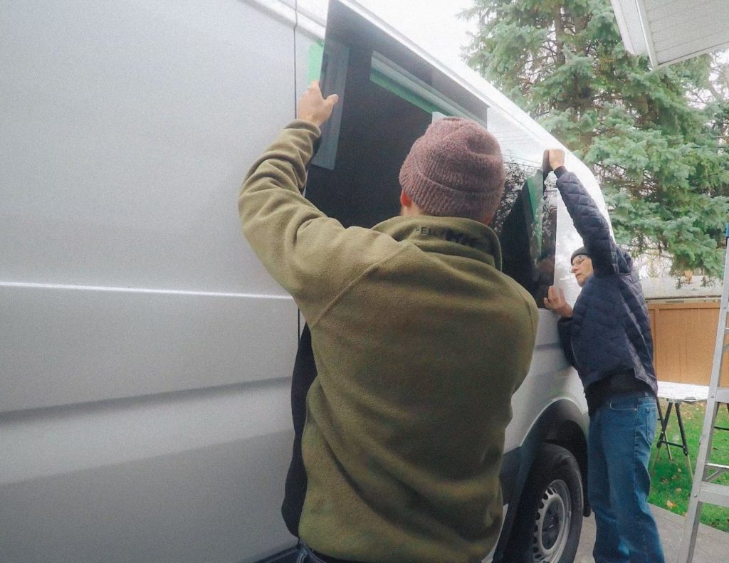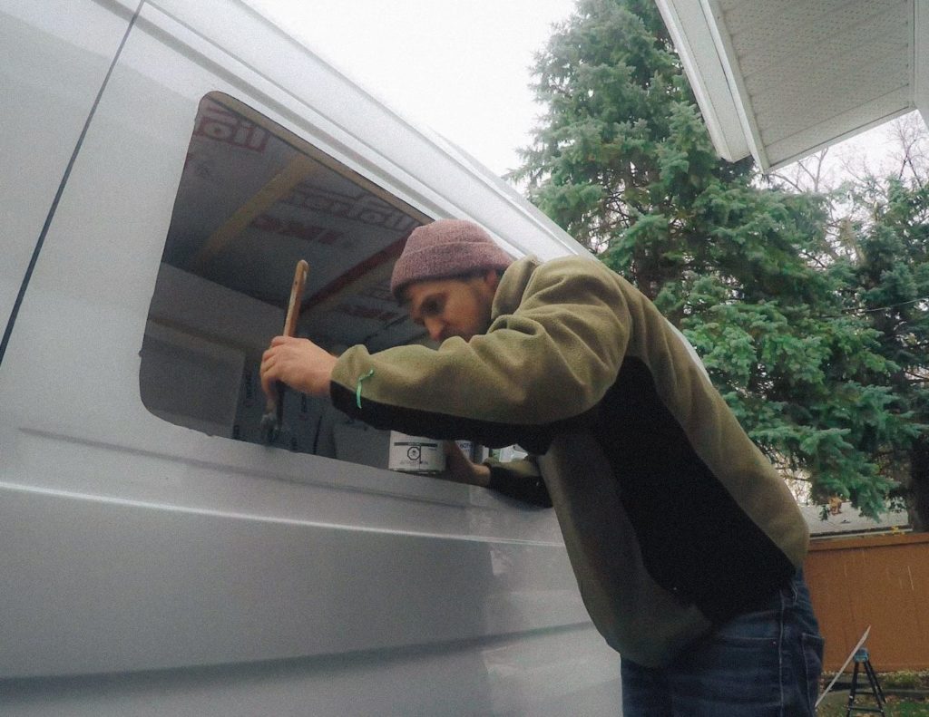 When cutting out the window hole, you need to follow the double wall thickness as closely as possible because the window dimensions from CR Laurence are a perfect fit. While I was cutting from the outside of the van, I found it helpful to have my Dad on the inside to make sure I was right on the line.