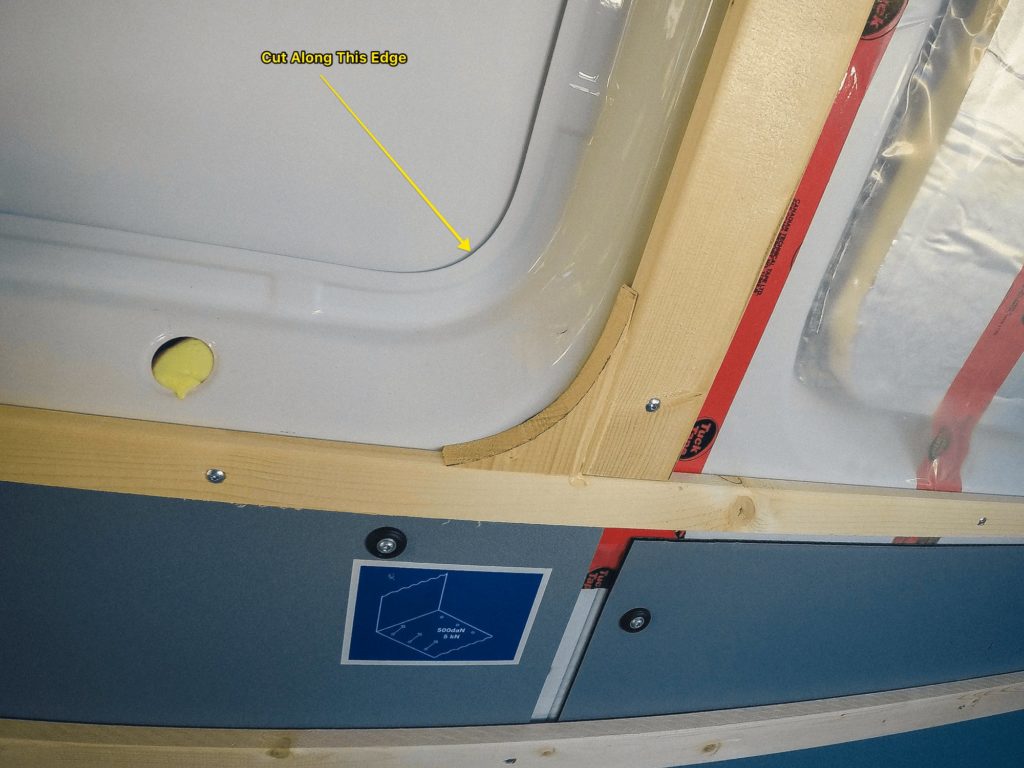 Once the window is cut, take the opportunity to trace out the opening for the wall panelling from the outside of the vehicle. Otherwise, it will be really difficult to map out and get the wall panelling to perfectly outline the window. So once the sheet metal was removed I tacked the wall panel in place on the interior and then went outside the vehicle and traced a cutline onto the panel.