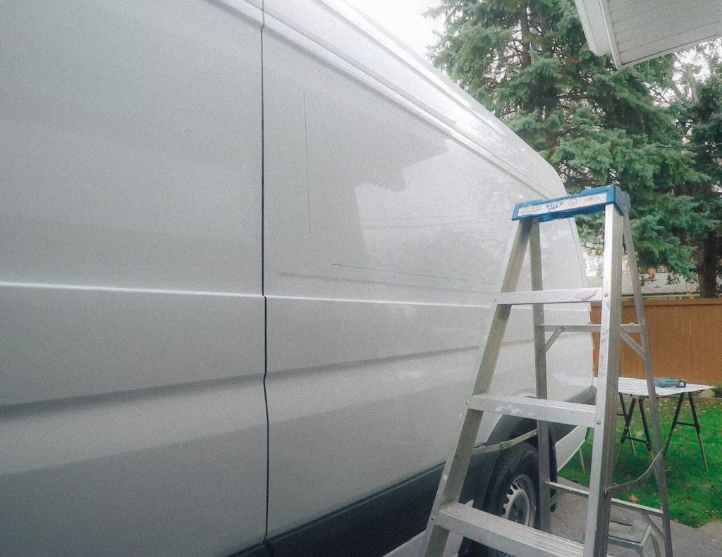 The next step is the first hard part….drilling holes into the outside of the van. Don’t worry! After you do one it gets much easier. I started by drilling out holes in all four corners on the interior of the van. Each corner got two holes on either side of the radius so that I could move to the outside of the van and connect all of the holes using a straight edge, following a cut line.