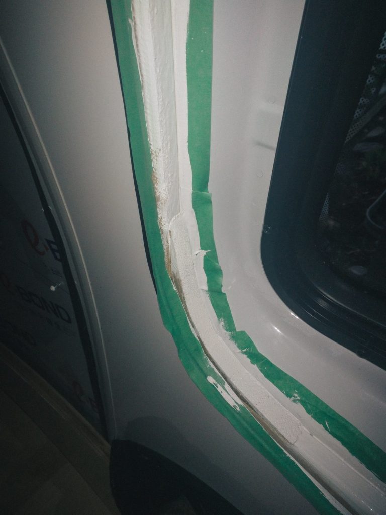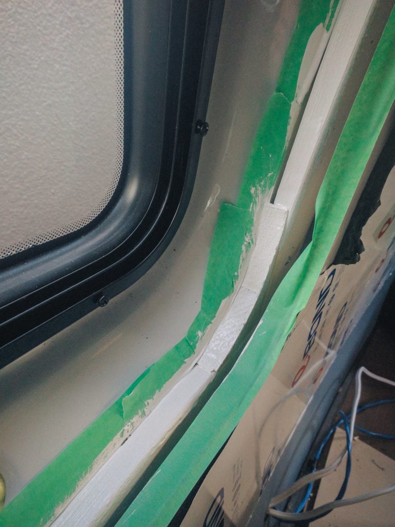 Now that I knew the window properly fit in the opening I removed the window and used a Tremclad metal paint to cover the bare metal edges before permanently installing the window.